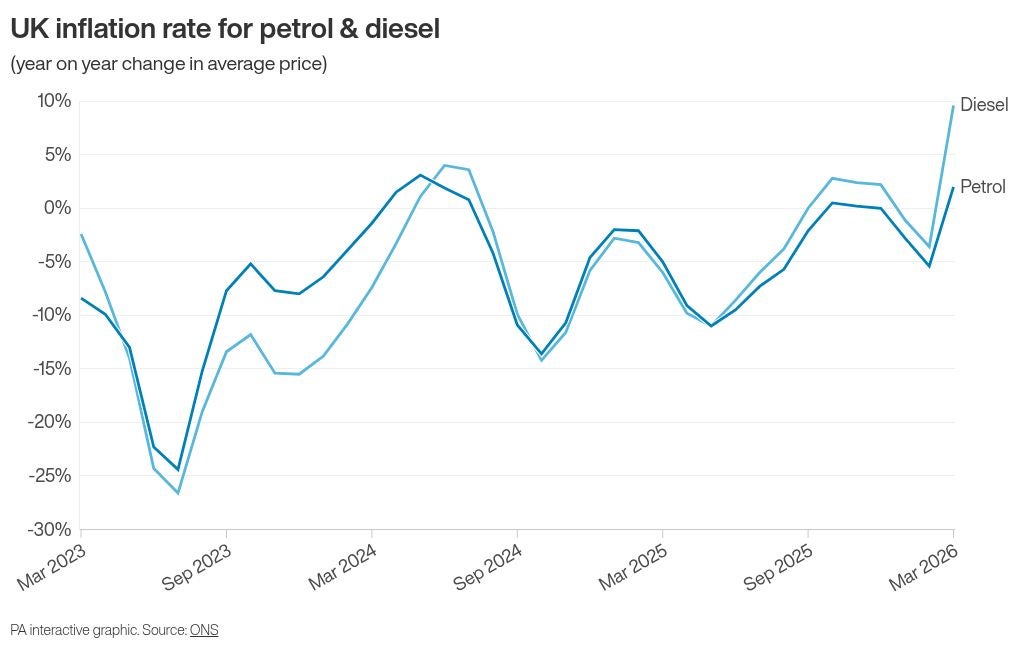 These surges mark petrol's highest rate since May 2024 and diesel's highest since February 2023, according to the Office for National Statistics (ONS).