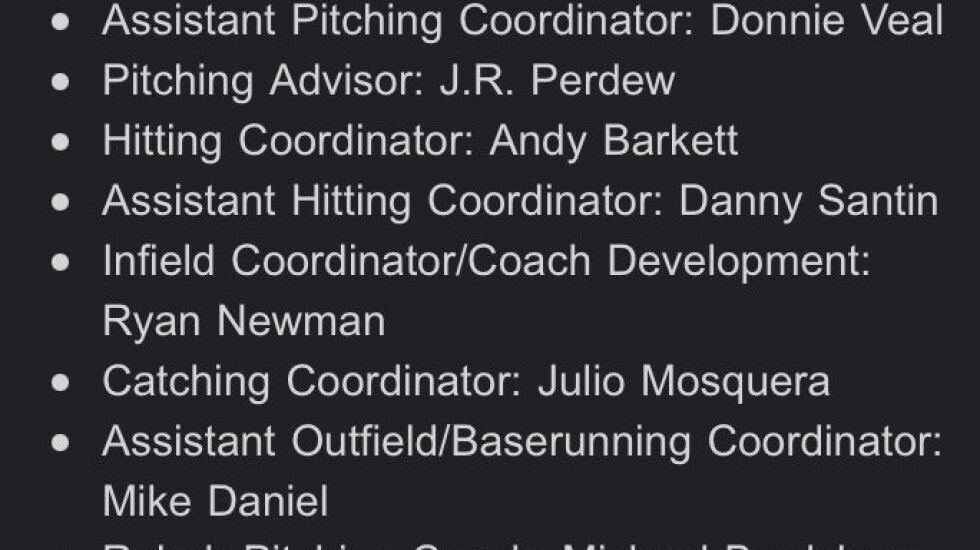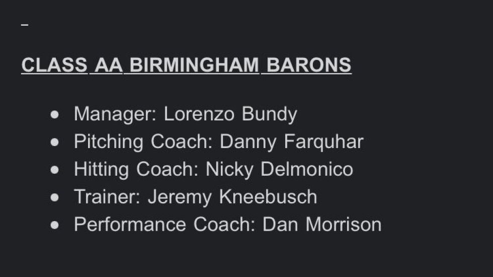 Former Sox outfielder Nicky Delmonico (hitting coach) and right-hander Danny Farquhar (pitching coach) were promoted from Winston-Salem to Birmingham, and former left-hander Donnie Veal was promoted from rehab pitching coach to assistant pitching coordinator.