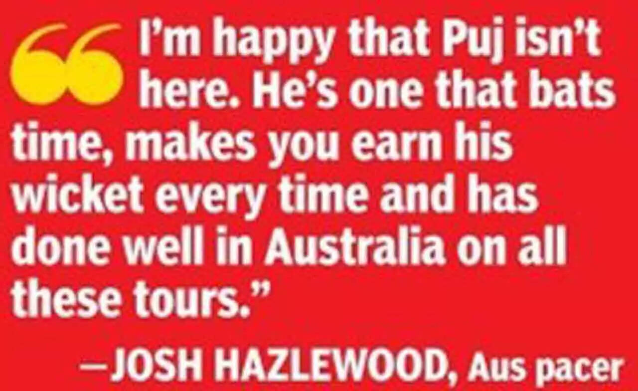 Speaking to reporters ahead of the first Test at Perth on Friday, Hazlewood said, "I'm happy that Puj isn't here. He's one that bats time, makes you earn his wicket every time and has done well in Australia on all these tours."