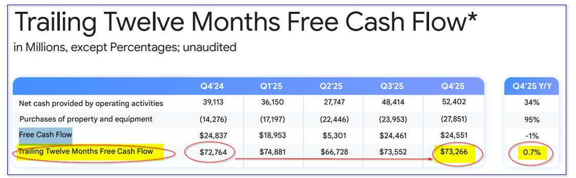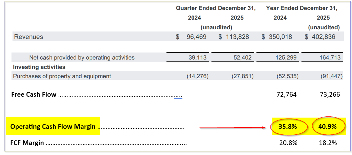 But, as the table above shows, the OCF margin was higher than the 35.8% OCF margin in 2024. In other words, cash flow, as a percent of revenue, rose 14.2%, based on its large capex AI-related spending (almost double).