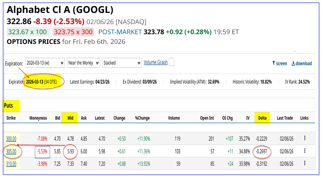 For example, look at the one-month forward puts expiring on March 13. It shows that the $305.00 put option contract has a midpoint premium of $5.93.