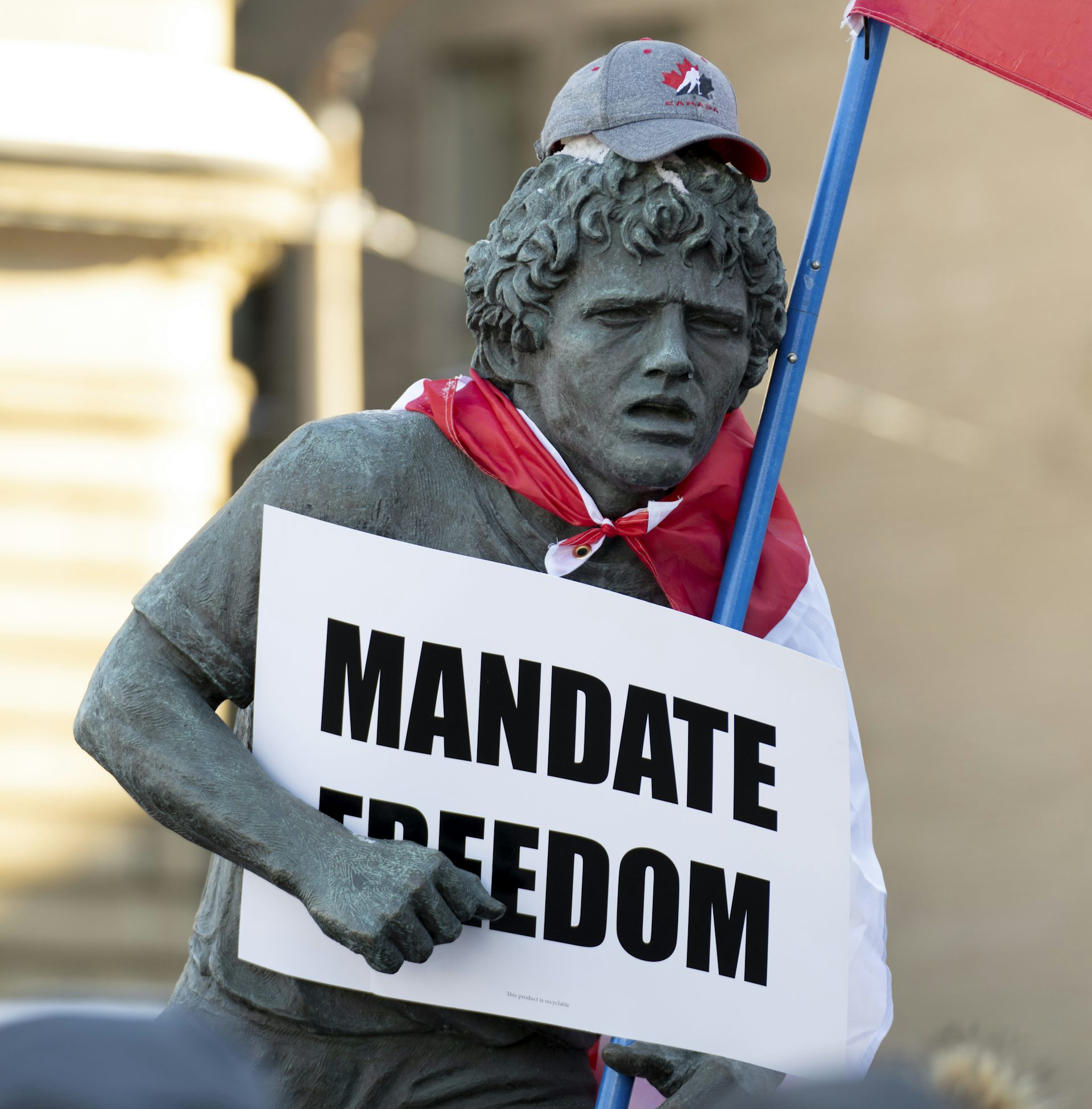One of the first things that happened when the so-called “freedom convoy” arrived in Ottawa was that anti-vaccine mandate protesters defaced a statue of Terry Fox near Parliament Hill. The statue was draped in Canadian flags and had a sign that read “Mandate Freedom” wedged under its arm.