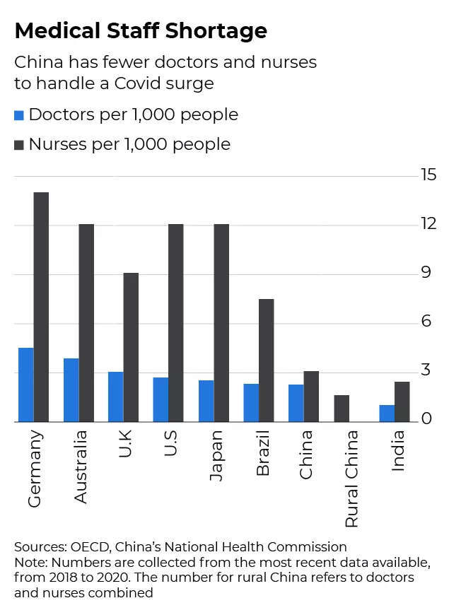 China's healthcare system was already a source of public discontent before the pandemic. While the government has expanded rural healthcare and state medical insurance coverage, there were fewer than three doctors per 1,000 people in 2020, behind major developed nations but also lagging Brazil, another populous emerging market that suffered a devastating Covid hit.