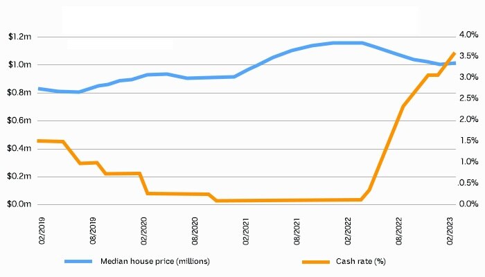 This graph shows how property prices in Sydney, and the official cash rate, have tracked over the past four years.