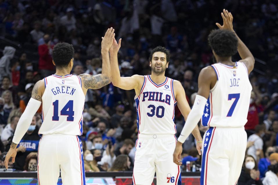 PHILADELPHIA, PA - OCTOBER 11: Danny Green #14, Furkan Korkmaz #30, and Isaiah Joe #7 of the Philadelphia 76ers react against the Brooklyn Nets in the first half at the Wells Fargo Center on October 11, 2021 in Philadelphia, Pennsylvania. NOTE TO USER: User expressly acknowledges and agrees that, by downloading and or using this photograph, User is consenting to the terms and conditions of the Getty Images License Agreement. (Photo by Mitchell Leff/Getty Images) Getty Images