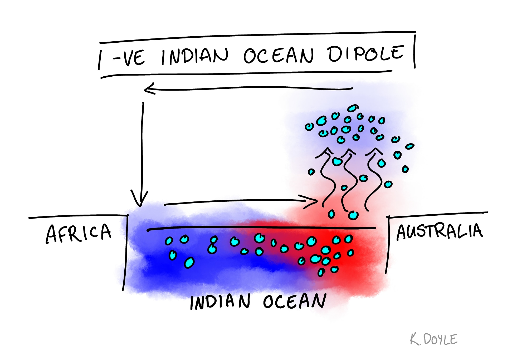 A negative IOD is much like the La Niña, but instead it occurs across the Indian Ocean.