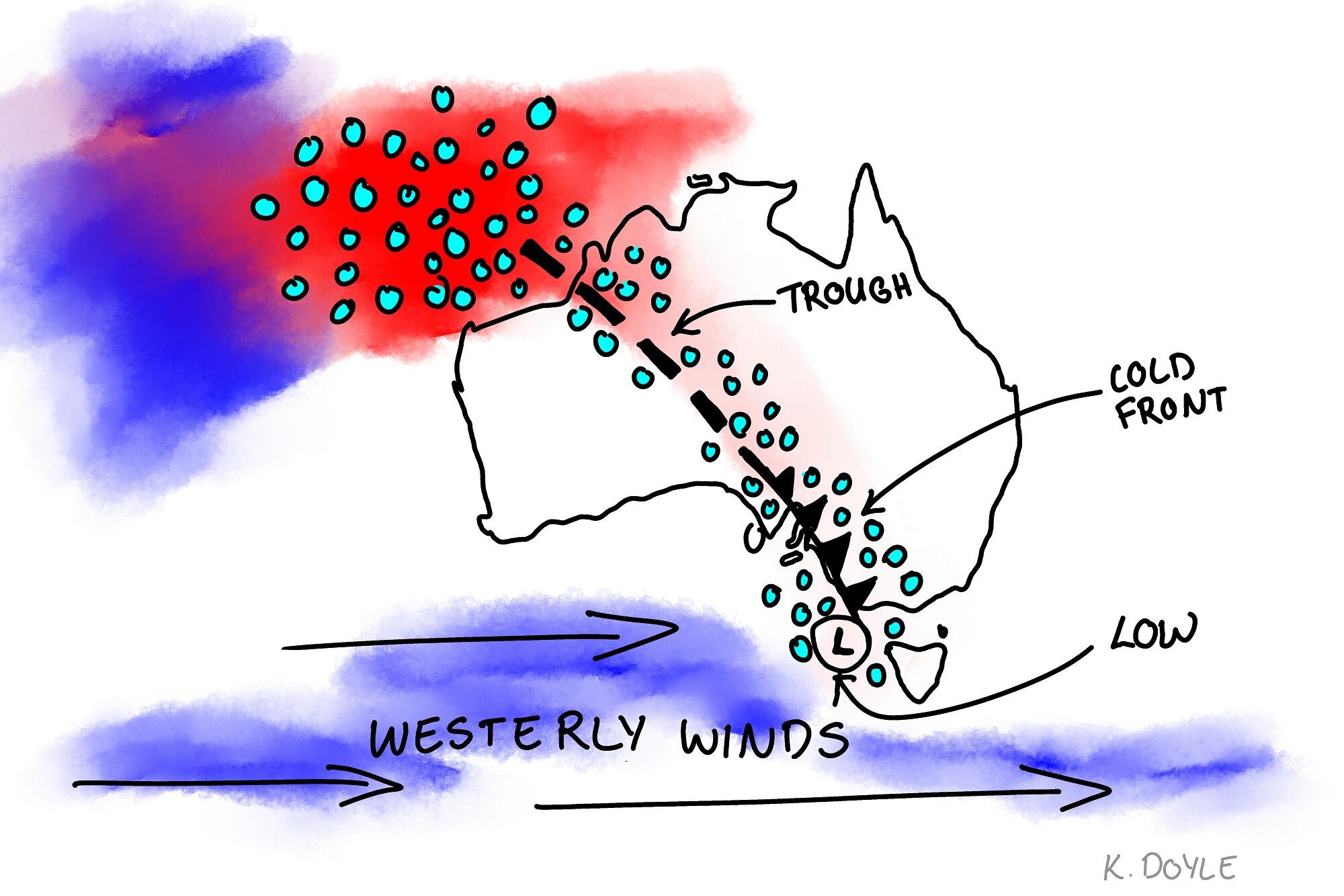 So again, warm waters near Australia encourage evaporation and lift, creating a moisture-rich atmosphere that the westerly winds can tap into as they move across the country.