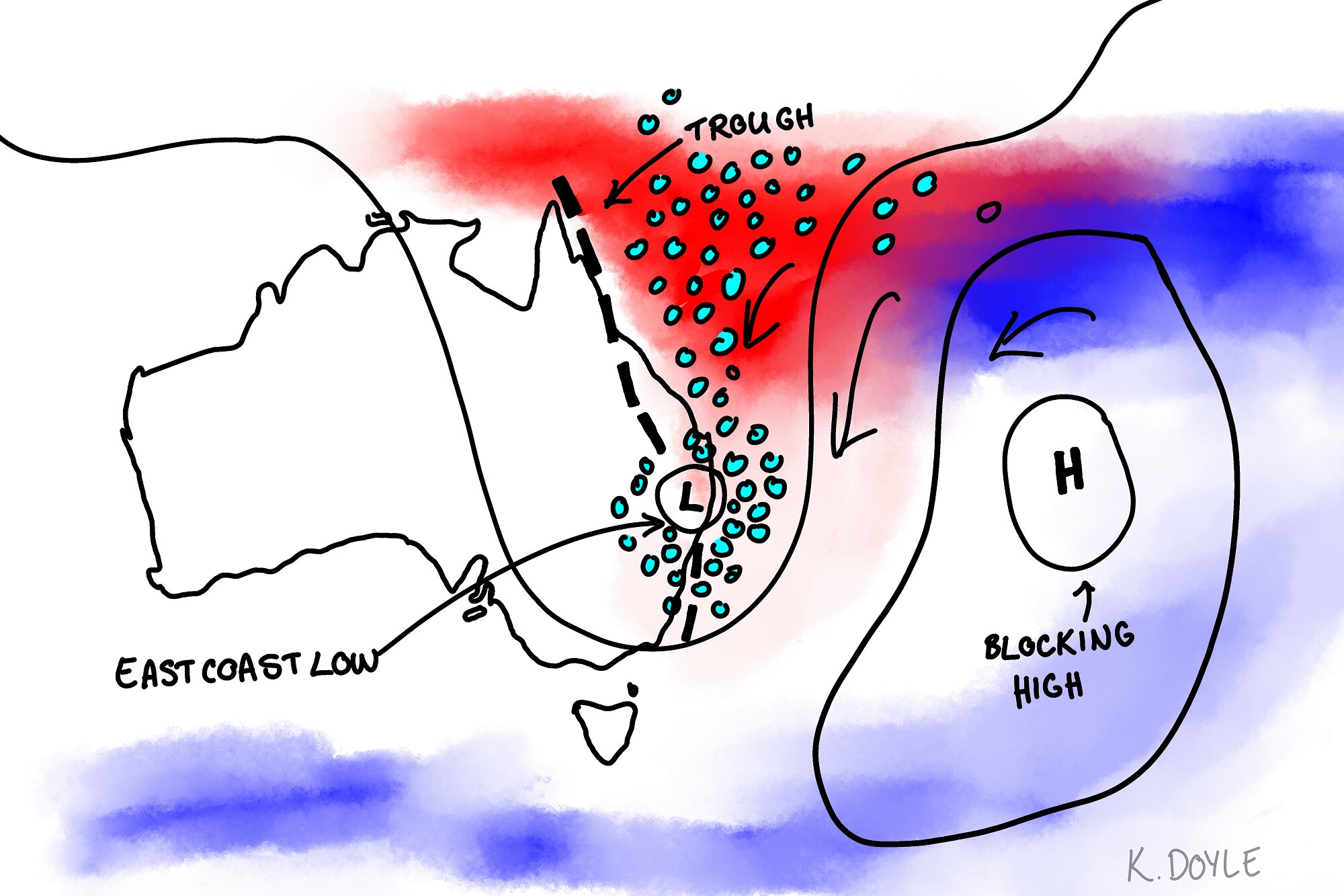 Significantly along the eastern seaboard a series of blocking highs in the Tasman Sea have generated easterly winds, pushing moist air onto the coast.