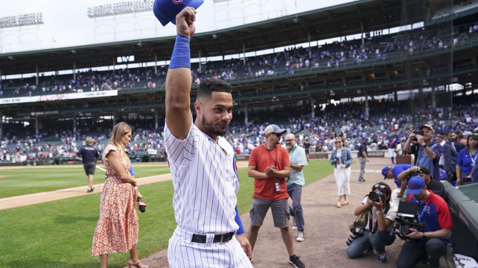 Six years later, his love for the Cubs — and for Wrigley — and zest for the game never have been in doubt. Nor has his connection with the fans, who greeted him Tuesday with a standing ovation before his first at-bat. Contreras backed away from the box and doffed his helmet before dumping a first-pitch single off Bryse Wilson into center. He later scored on a double by Ian Happ, another Cub who might be on the way out any day now.