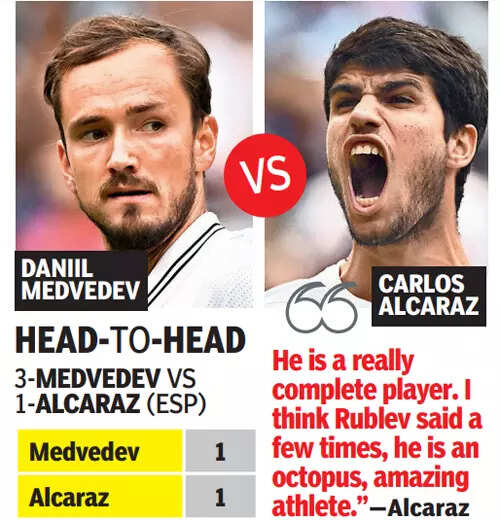 Alcaraz, with more range in his shots than flavours in a candy shop, was asked as many questions on ‘the filming’ in his media conference, as he was about Medvedev with whom he shares a 1-1 win-loss record.