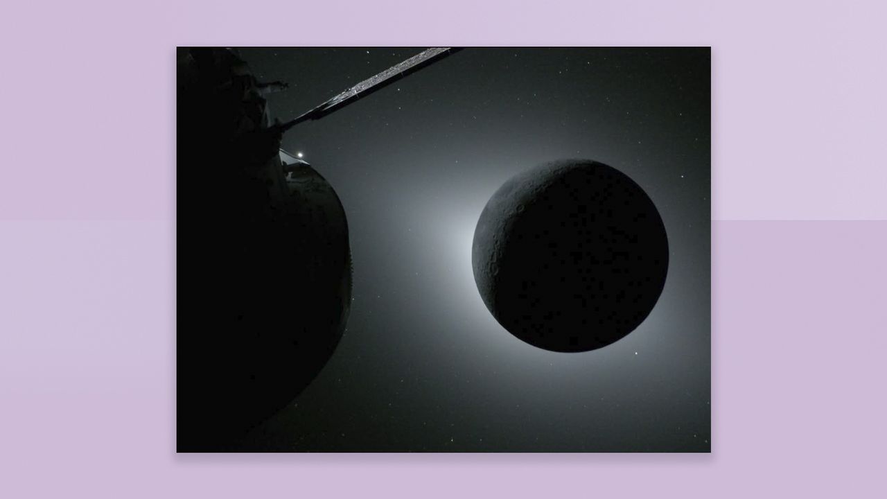 One frame captures the Moon in shadow with a glowing halo of sunlight, while another shows the Orion spacecraft drifting past a sharply detailed lunar surface.