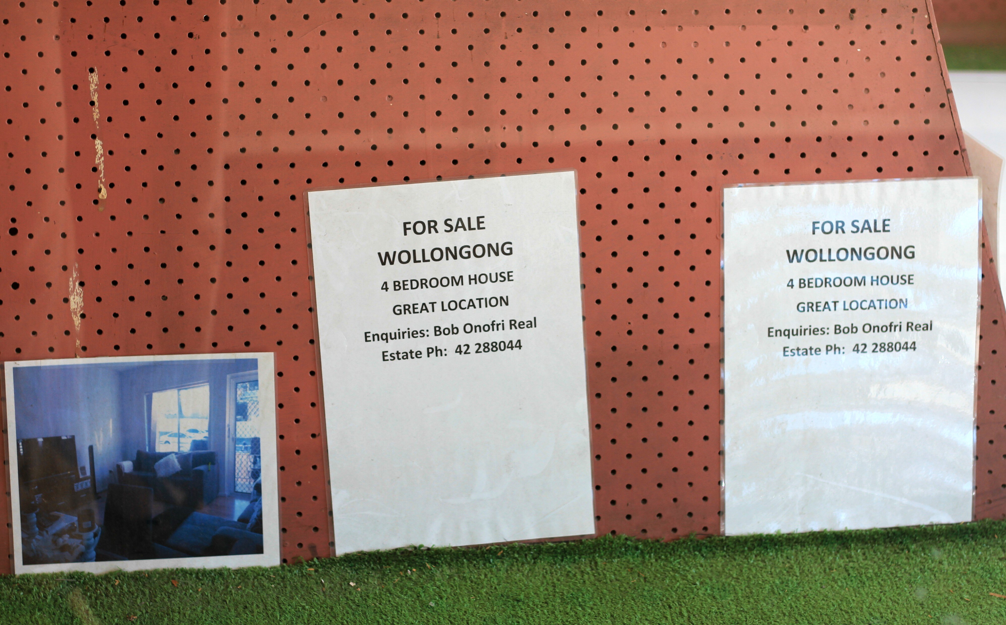 Property details are instead scrawled on pieces of paper and a whiteboard beside printed photos tacked up at the front of his Wollongong business.