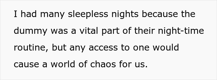 The kid’s baby sibling was in the teething stage, and pacifiers were needed to ease the discomfort. That’s why the couple needed dummies in the house, but it started turning into a nightmare. Their toddler would steal it from the baby’s mouth and throw a tantrum if the couple tried to take it away. OP also caught the kid trying to sneak into her room, trying to find it.