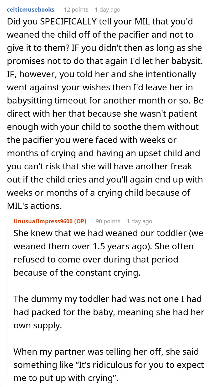 What further annoyed netizens was that the mother-in-law never really shared the real reason why the kid was crying so much that she had to give them a pacifier. OP claimed that both her children are pretty chill and don’t really throw a fit. Even when she tried to understand the reason, the woman kept giving vague replies.