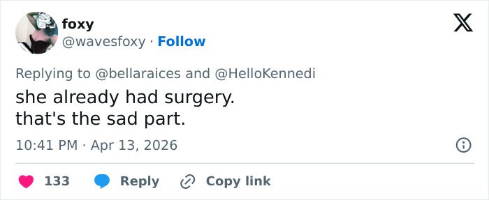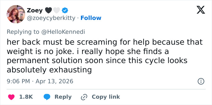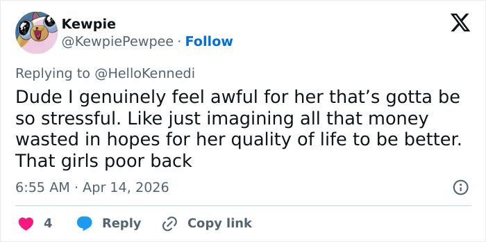 “Dude, I genuinely feel awful for her. That’s gotta be stressful. Like, just imagine all that money wasted in hopes her quality of life would be better,” a separate user sympathized.