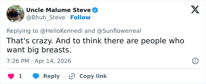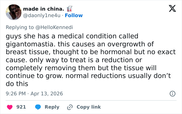 Social media users shared confused reactions to the development, with one writing, “Can someone please explain how it’s possible for the breast to just grow back?” and another adding, “Do you mean the breast just got revenge for cutting it off?”