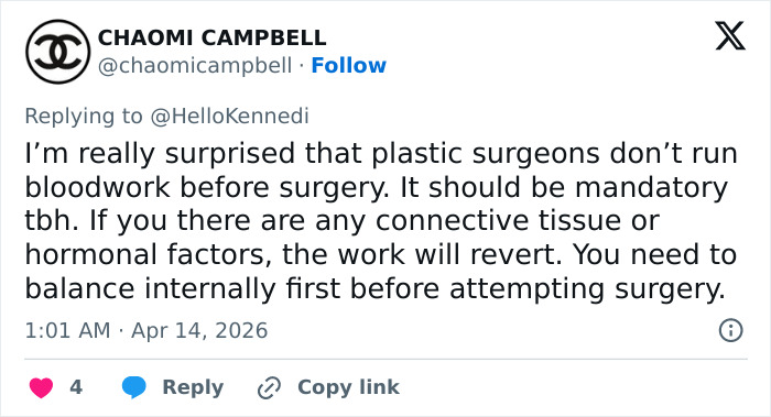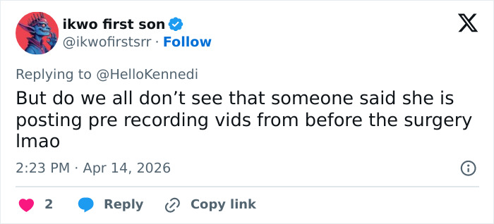 By April 2026, however, her followers began noticing that her breasts had returned to looking as they did before her surgery.