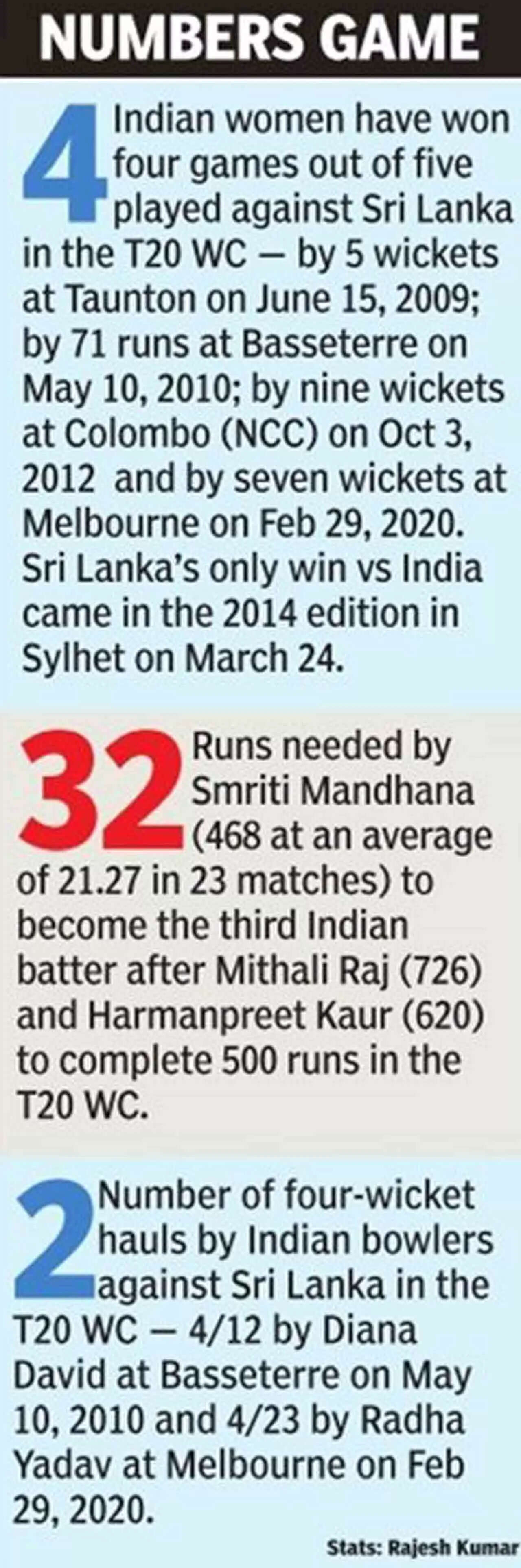 The onus will be on Mandhana to take the lead against Sri Lanka's spin-heavy attack. Although her record against Sri Lanka is not impressive, with only 379 runs from 19 innings, including two half-centuries, she must provide the team with a solid start in this crucial league match. The bowlers too are yet to come into their own.