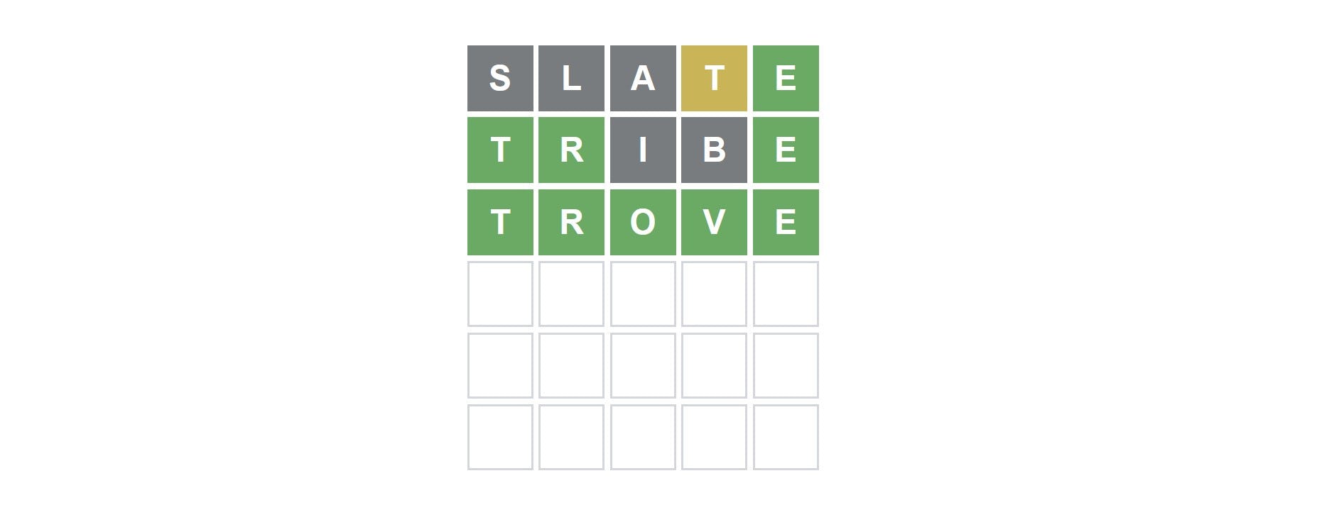 This time we got a bit lucky given that our chosen starting word, SLATE, only offered us hints about the T and the confirmed location of the E. Our next guess, TRIBE, just so happened to be a very effective one that kept the E in its proper place while moving the T elsewhere. With three green tiles now revealed, we went with TROVE as our final guess.
