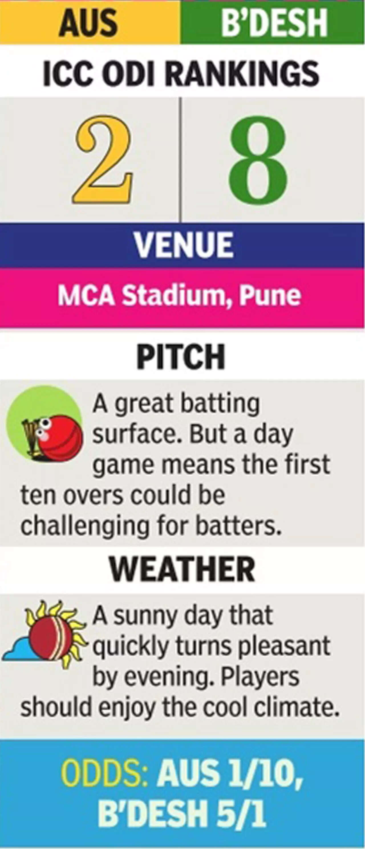 Australia have never played a World Cup game in Pune and this will be their first ever face off against Bangladesh in India. They must not make the mistake of resting leggie Adam Zampa (20 wickets @19, strike rate 21, ER 5.56).