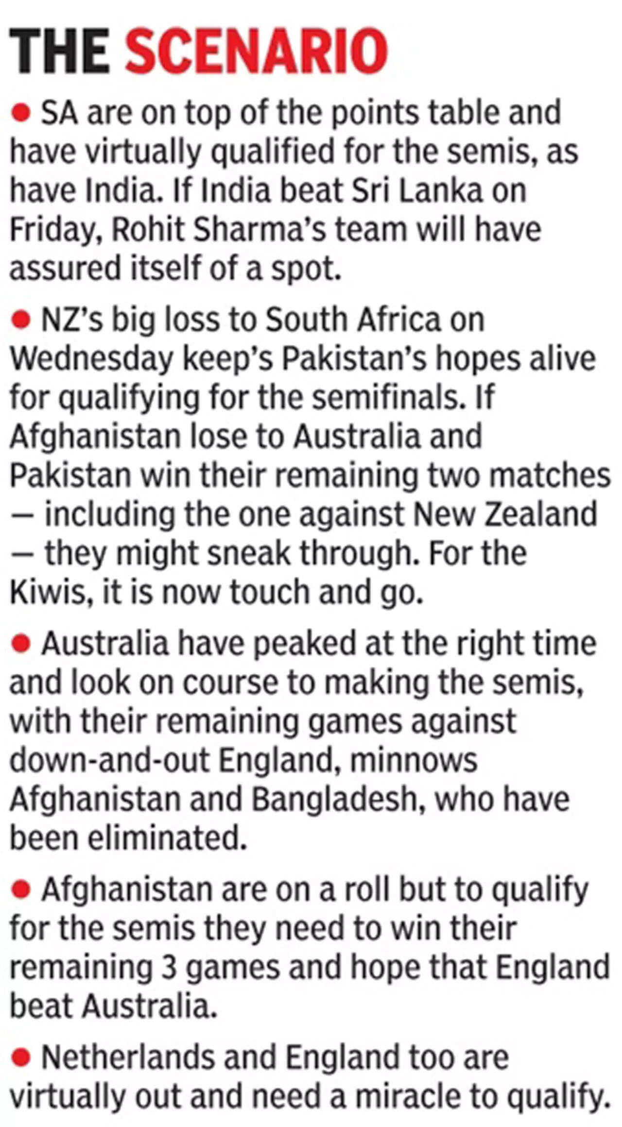 “We do believe that we still have a good chance of entering the semifinals,” Fakhar Zaman, one of the heroes of the seven-wicket win, said at the Eden Gardens here after the match. “Some of the results of the other matches have to go our way.”