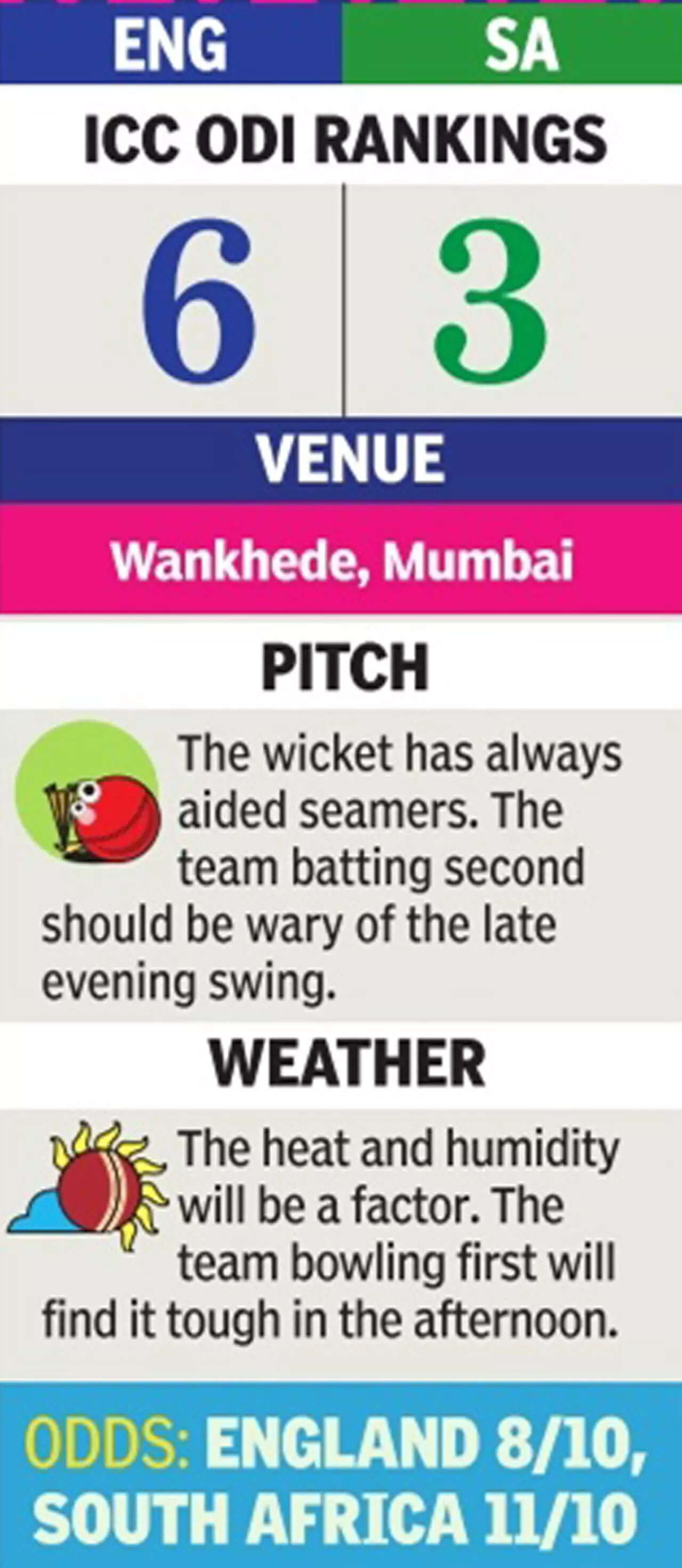 It's not that South Africa won't be feeling the heat. Both teams have suffered shock losses in their last game to unheralded opponents. England were humbled by Afghanistan by 69 runs in New Delhi last Sunday while South Africa's unbeaten two-match run was ended by The Netherlands in Dharamshala as they went down by 38 runs.