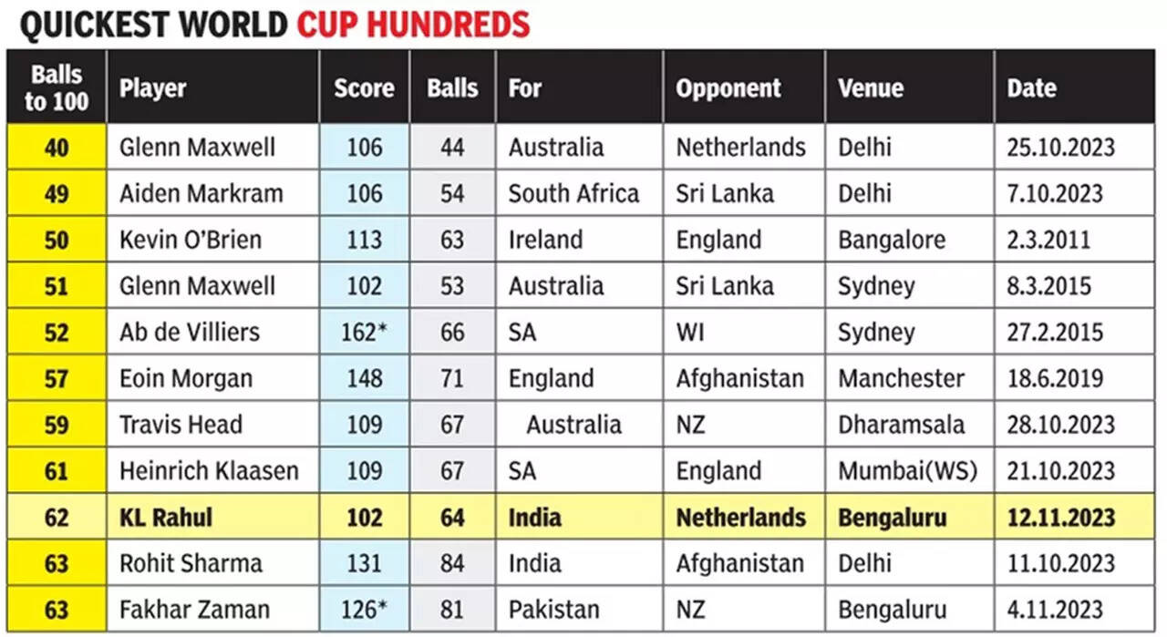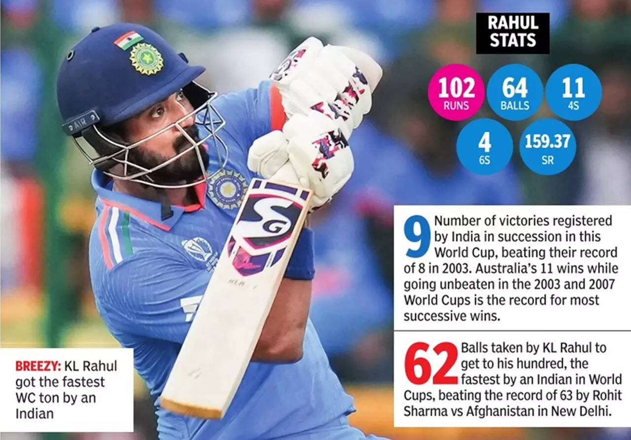 <p>KL Rahul took 62 balls to get to his hundred, the fastest by an Indian in World Cups, beating the record of 63 by Rohit Sharma vs Afghanistan in New Delhi. </p>Reuters