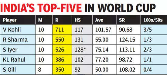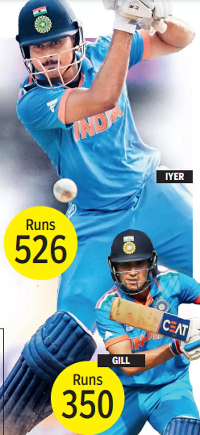 Iyer, after enduring a quiet time and falling to ungainly pull shots initially, has logged 526 runs at a strike-rate of 113.11 to become the first middle-order batter to score over 500 runs across all World Cups.