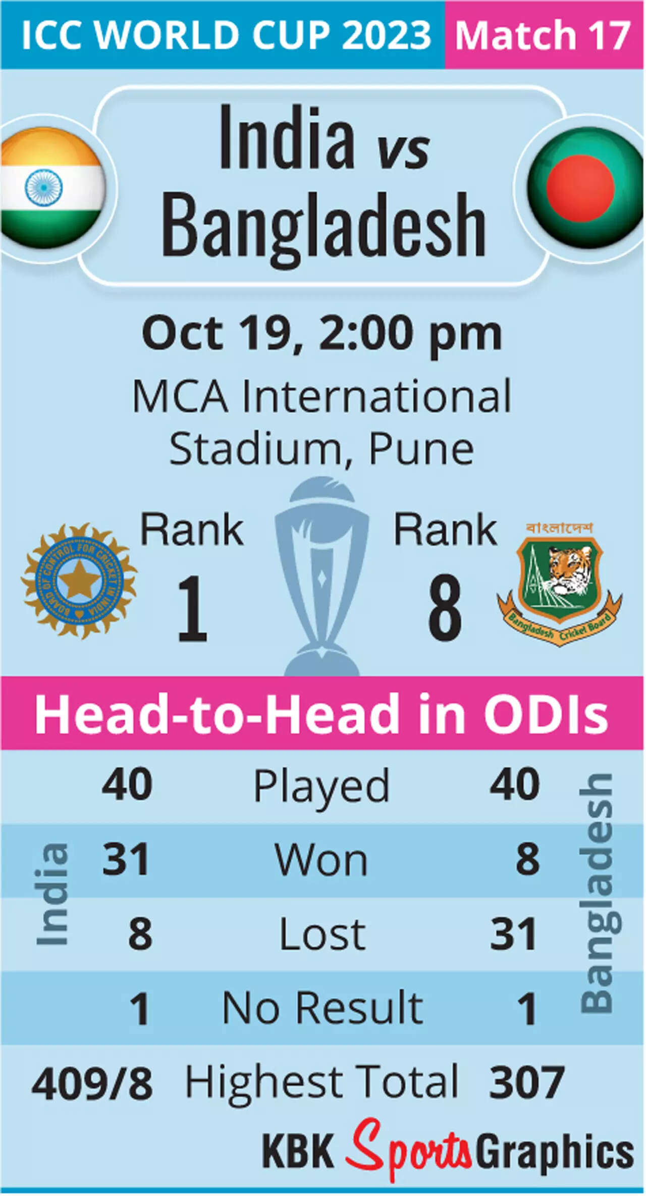 Bangladesh are no pushovers, and they have shown to be a difficult opponent for India to face, but the understanding of the conditions and an anticipated full stadium at the MCA Stadium guarantee India the finest atmosphere once again to record another win in this World Cup and continue their march into the quarterfinals.