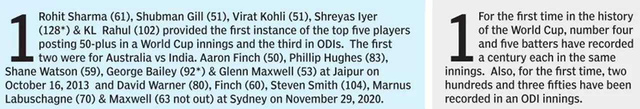 It was a scorecard for keeps with the first three batters - Rohit Sharma (61), Shubman Gill (51) and Virat Kolhi (51) - scoring half-centuries and the No. 4 and No. 5 - Shreyas Iyer (128 n.o; 94; 10x4; 5x6) and KL Rahul (102; 64b; 11x4; 4x6) - sizzling with centuries.
