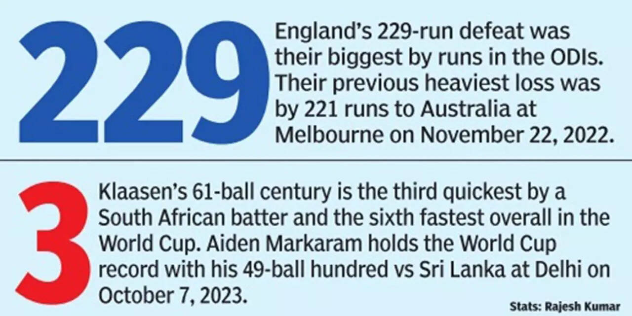 The margin of defeat sent England's net run rate on a downward spiral to -1.248 and qualification for semis now seems as far as London is from Mumbai. No side has been as brutal as South Africa while batting first in this World Cup. Their scores of 428-5 (vs Sri Lanka, New Delhi); 311-7 vs Australia, Lucknow are a pointer to that.