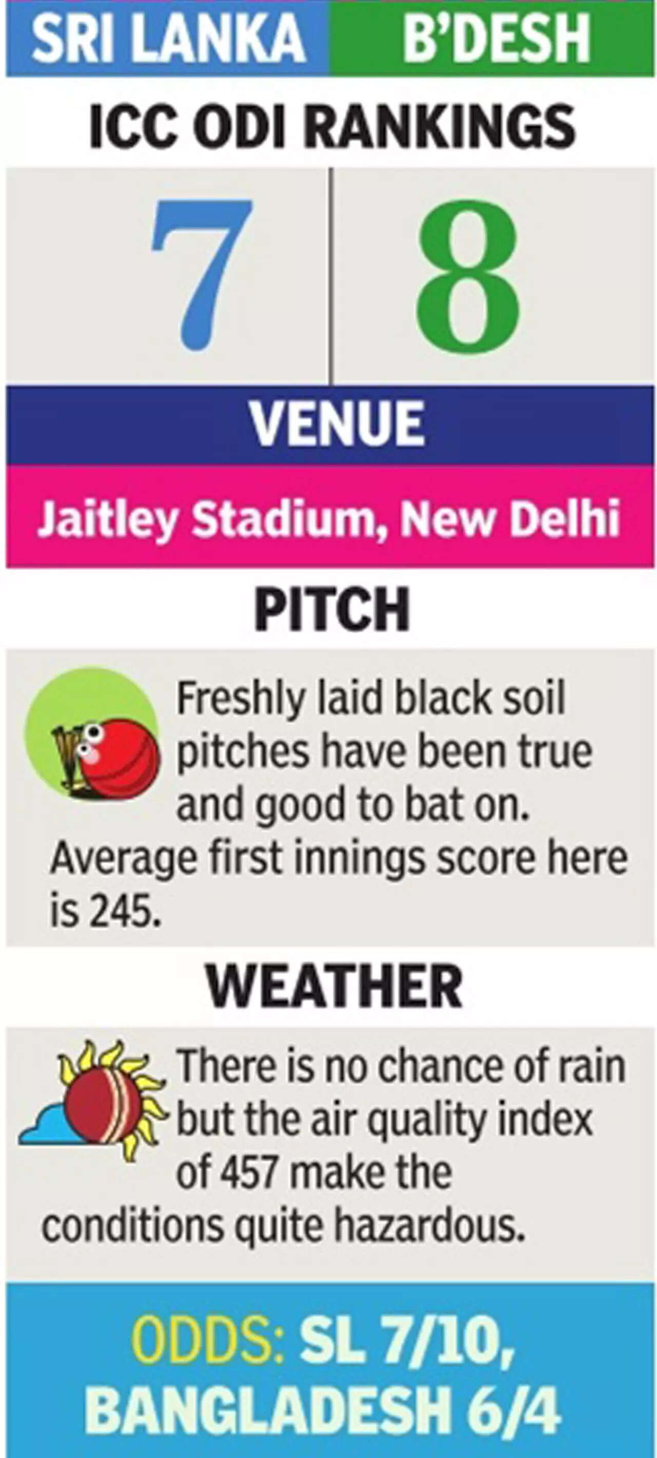 NEW DELHI: The scenes at the Arun Jaitley Stadium on Sunday weren't ideal for a World Cup match eve. Players from Bangladesh and Sri Lanka turned up for practice wearing masks. The match between these two Asian countries holds very little significance to the outcome of the tournament. But, with a place in the Champions Trophy in 2025 yet to be finalized, these teams are still looking to go hard at each other.