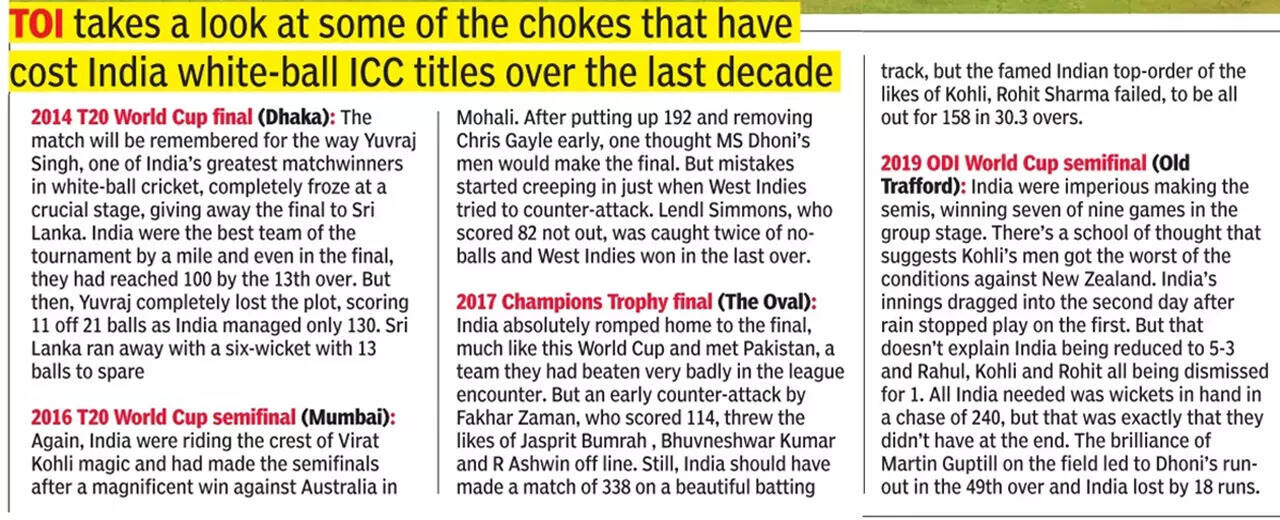 Since the 2013 Champions Trophy triumph in England, India have hit a similar trajectory. In ICC events — in T20s and ODIs — India have consistently made the semifinals and final, but haven’t been able to cross the line. Coach Rahul Dravid acknowledged on Sunday after the defeat that the team hadn’t been able to play to their potential on big days, but he dismissed the idea that they were “scared” in the final.