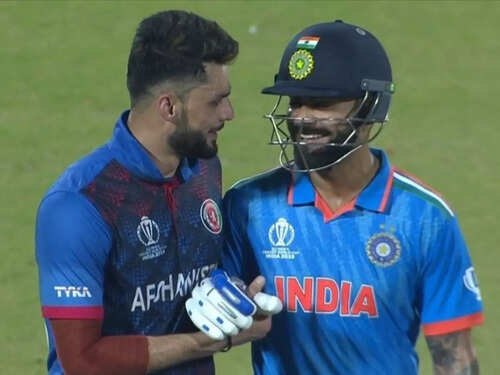 <p>In a heartwarming moment, Afghanistan's Naveen-Ul-Haq and India's Virat Kohli, who had a heated face-off during IPL earlier this year, were seen sharing pleasantries in Kohli's home ground. (PTI Photo) <br /></p>