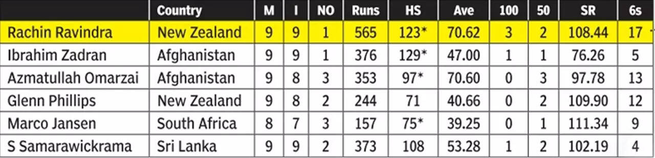 The Afghanistan opener's upright stance, immaculate balance while playing strokes and assuredness in foot movement was impressive. Ibrahim swears by the text book. An immaculate technique helped the 21-yearold take on quality fast bowlers like Mitchell Starc, Josh Hazlewood, Pat Cummins, Shaheen Afridi and Haris Rauf without much distress. His 87 against Pakistan helped Afghanistan gain a famous victory against the cross-border rivals. Zadran's most memorable knock, however, was against Australia at the Wankhede Stadium. He stayed in the middle for the entire 50 overs and scored an elegant unbeaten 129. His brilliance helped Afghanistan post 291/5 and almost beat the five-time world champions but for Glenn Maxwell's miraculous knock. Zadran finished the World Cup as Afghanistan's highest run-scorer with 376 runs at an average of 47.00. His hundred against Australia was Afghanistan's maiden century at World Cups. His nonchalant flick for a six to a 150kmph delivery by Starc has to be one of the shots of the tournament.