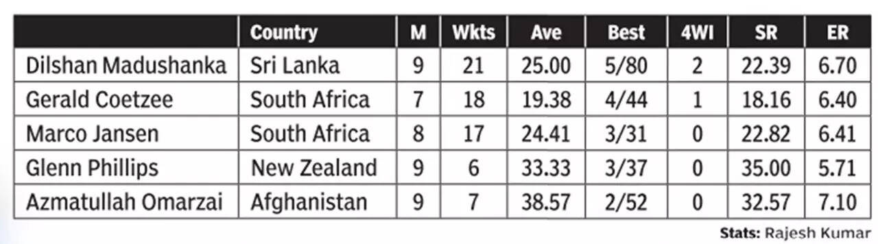 Before the World Cup, the bowler widely expected to take wickets in his opening spell was Pakistan's Shaheen Afridi. But as the tournament progressed, Sri Lankan new ball bowler Dilshan Madushanka swung his way into the record books with most wickets in the first Powerplay overs. His off-cutter to Rohit Sharma at the Wankhede that sent the Indian captain's stumps cart wheeling, has been one of the moments of the tournament. It was a clever piece of bowling by the left-arm pacer. As Rohit was expecting the ball to swing back in, he opened up his stance and the ball curled past the outside edge of his bat to rattle the stumps. Madushanka finished the tournament with 21 wickets from nine games at an average of 25.00 and a strike rate of 22.39, second in the list of highest wicket-takers after the league stage. Madushanka's strength has been the amount of swing he gets with the new ball. He also bowls a deceptively quick bouncer.