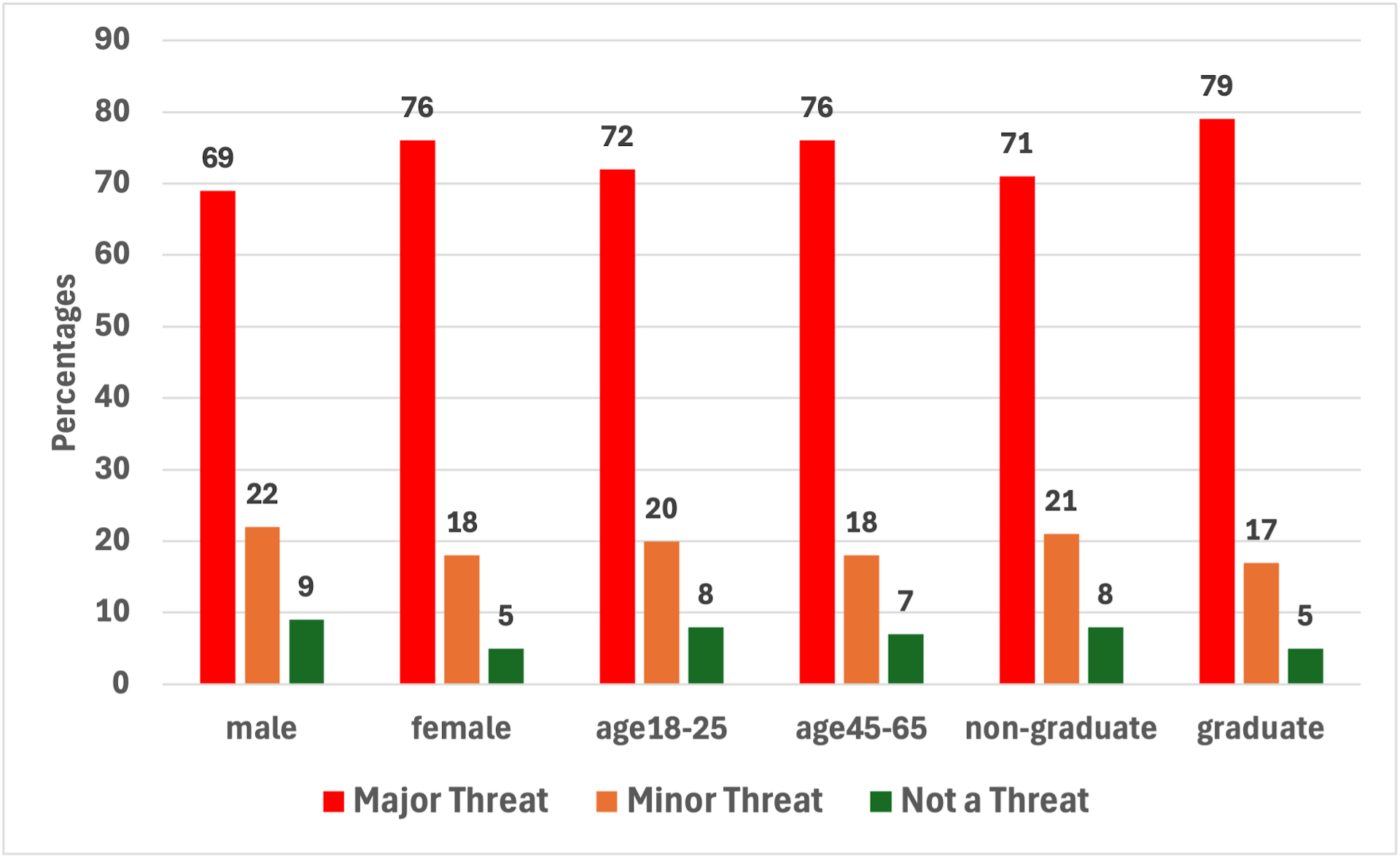 Large percentages of the respondents in these countries see climate change as a major threat, something that was also evident in the first chart. Women (76%) are more likely to think it is a major threat than men (69%); people aged 56-65 are more likely to think it (75%) than young people between the ages of 18 and 25 (72%); and graduates (79%) are more likely to think it than non-graduates(71%). But the variations in attitudes across these groups are not large.