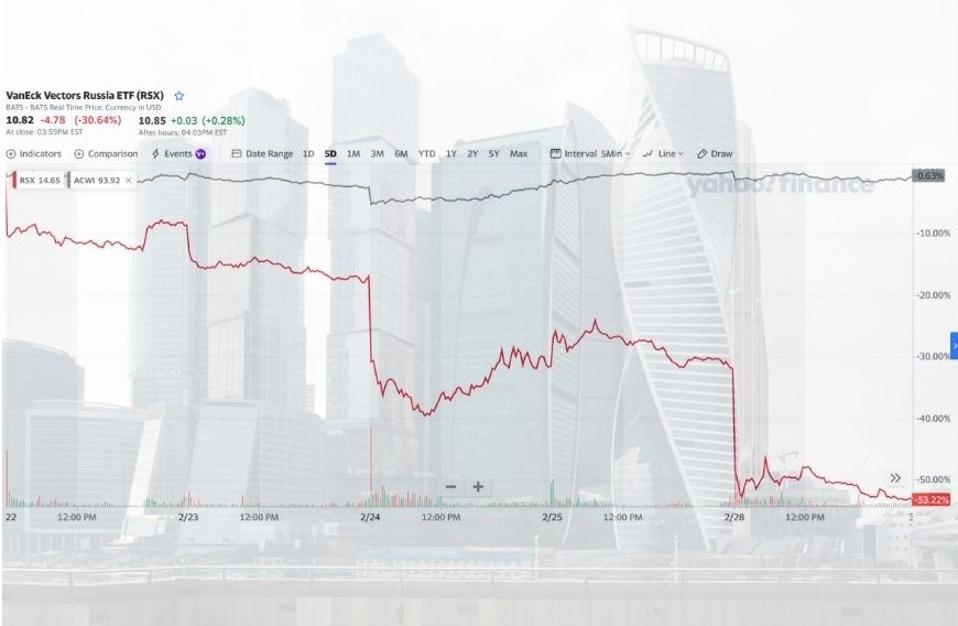 The VanEck Russia (RSX) exchange traded fund fell over 50% in a week. It is unclear if this fund will even exist in the weeks ahead.