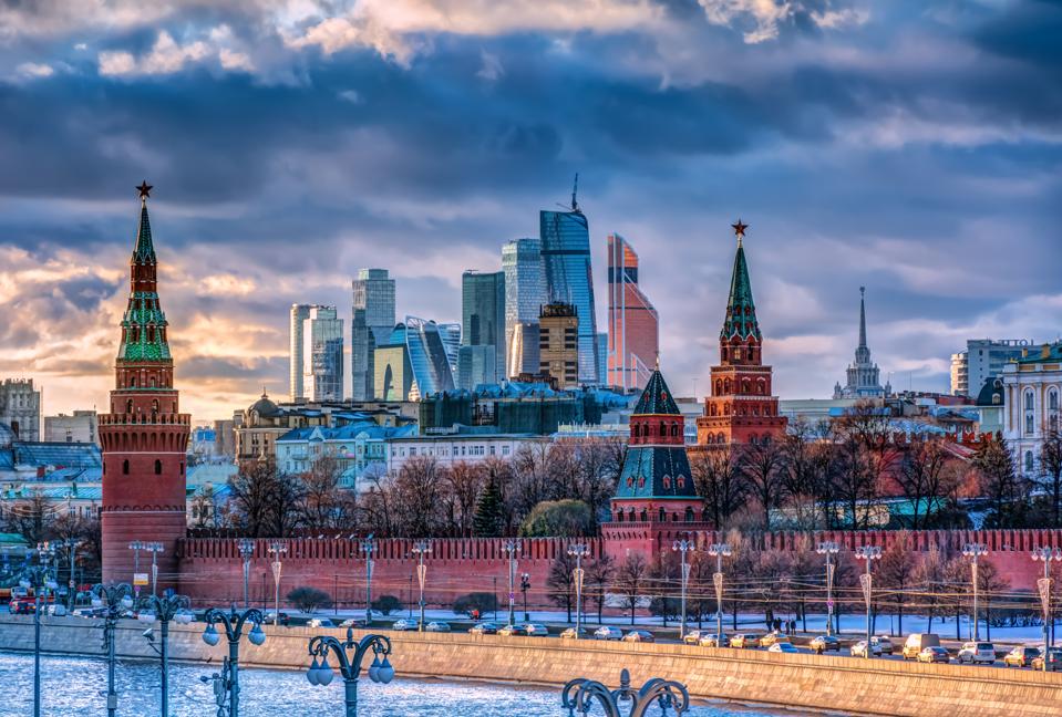 A portion of Red Square with modern office towers in the background. Old animosities have iced Russia's financial and business ambitions. Getty