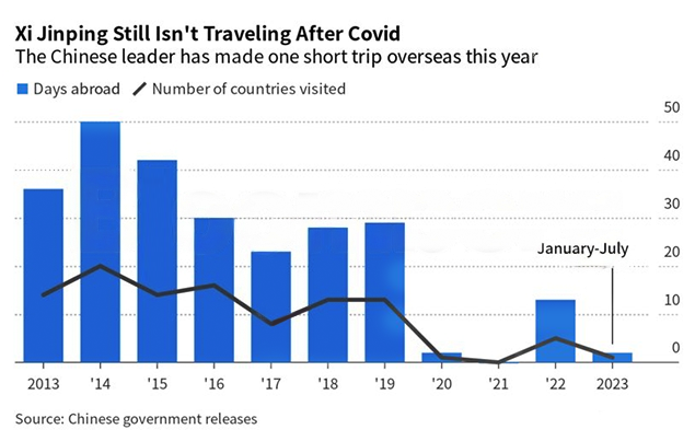 Xi’s border hop to visit Russian President Vladimir Putin in March has been his sole trip abroad, representing the shortest amount of time he’s spent overseas in the first half of a year since taking power, excluding the pandemic.