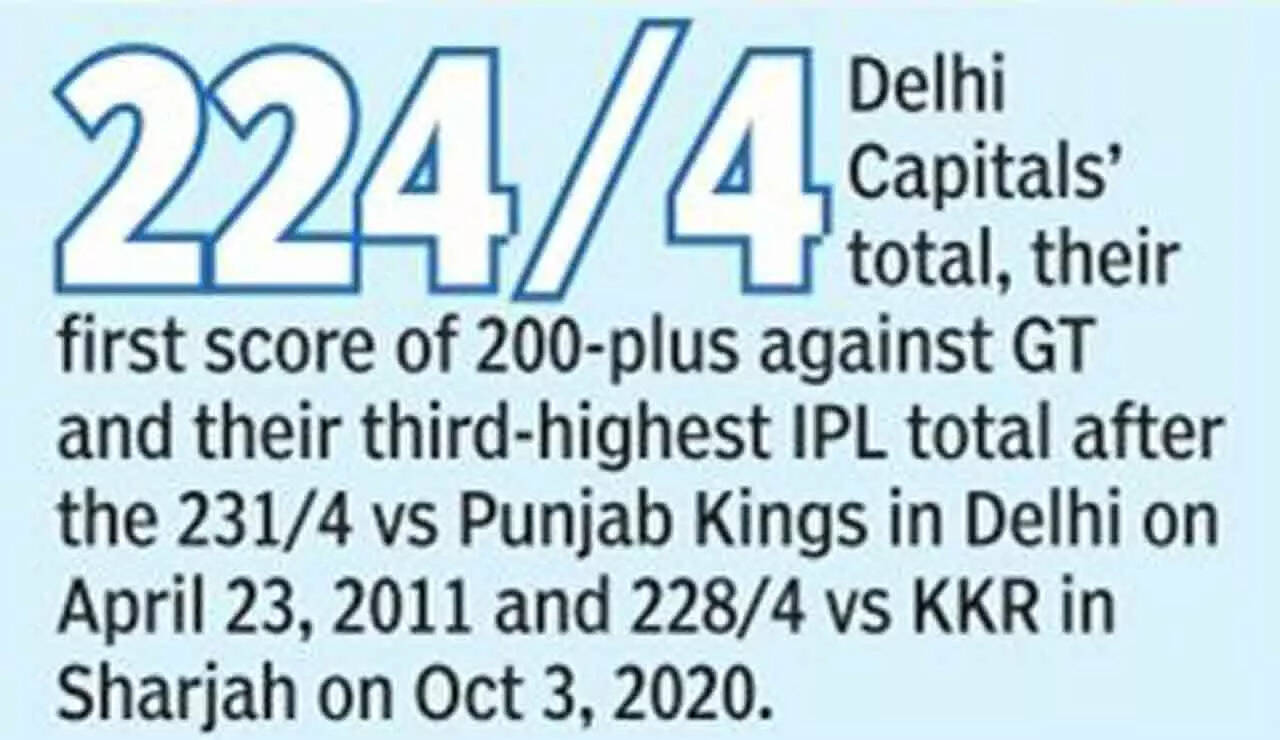 Gujarat ran Delhi close in their pursuit of 225. The chase was put on course with an 82-run partnership between Wriddhiman Saha (39 off 25b; 5x4, 1x6) and Sai Sudharsan (65 off 39b; 7x4, 2x6). Their dismissals saw David Miller (55 off 23b; 6x4, 3x6) pick up the mantle, but the South African couldn't see it through for the Titans and was dismissed in the 18th over.