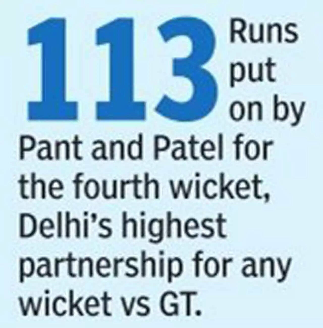 The DC innings was resurrected by a 113-run fourth wicket partnership between Pant and Axar Patel (66 off 43b; 5x4, 4x6) after the team was tottering at 44/3 at one stage.