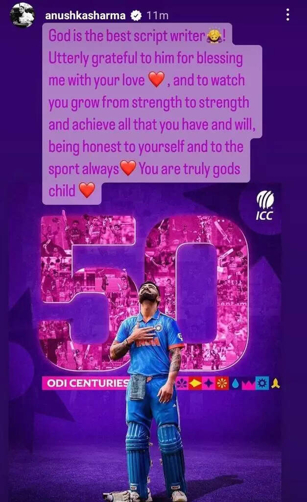 NEW DELHI: Actor-producer Anushka Sharma expressed her gratitude and admiration for her husband, Virat Kohli, as he created history by scoring his 50th ODI century during the ICC Cricket World Cup semi-final against New Zealand. India's resounding 70-run victory in the match added to the celebration of Kohli's remarkable achievement.