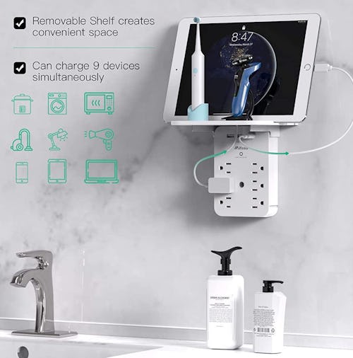 Electric toothbrushes, smartphones, television remotes — the shelf on top of this outlet extender is so sturdy that it can hold all of them and more. There are also two extra USB ports so that it’s easy to charge your gadgets without locating a power brick, as well as six plugs in total.