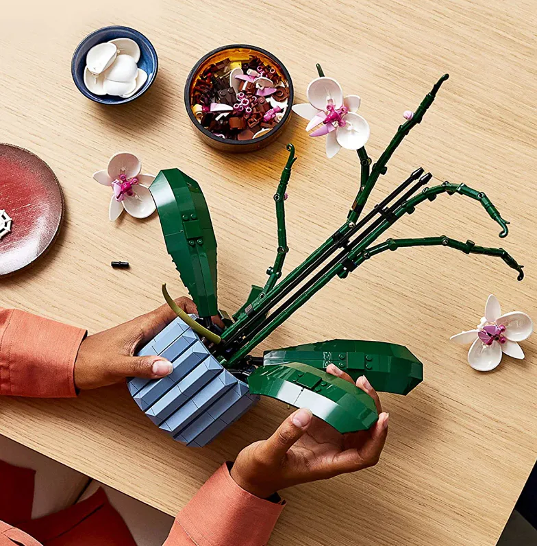 If you’re into crafts and houseplants, you’ll find this orchid flower LEGO set hard to resist. It boasts several realistic-looking blooms in different sizes, plus bendable stems and leaves in a dark green color. It even comes with brown pieces that look like soil and a modern, sky-blue pot.