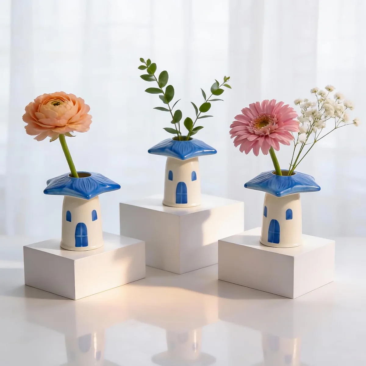 If your vase collection consists of plain glass holders leftover from supermarket bouquets, you’ll definitely welcome the whimsical feel of these bud vases. They look like miniature houses with flower rooftops and are handcrafted from ceramic. You get three vases in a very affordable set.
