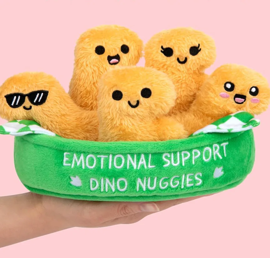 These adorable dino nugget plushies are like a little basket of emotional support. The cuddly crew includes five stuffies, each with a unique little expression to bring on the calm and cheer. And they’re even available as donuts, fries, and more.