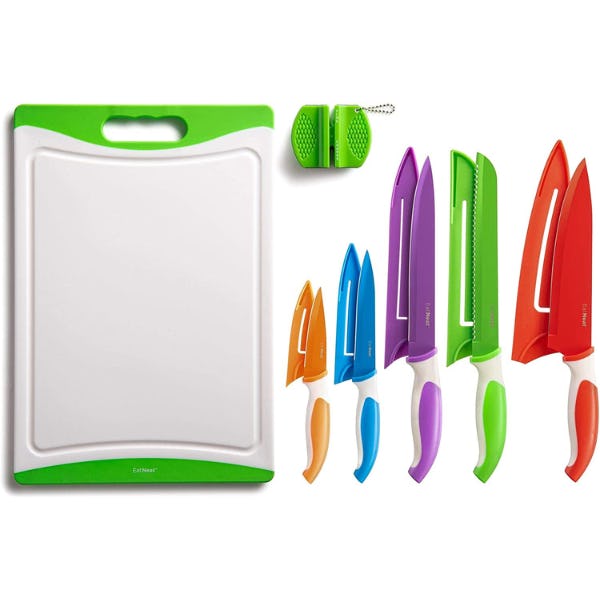 Set your kitchen up in color with this bright knife set that comes with blade covers, a sharpener, and a cutting board to match. There is an 8-inch chef’s knife, an 8-inch serrated bread knife, a 5-inch utility knife, and a paring knife, each in a different bright color. The board has a moat to trap juices and can go in the dishwasher.