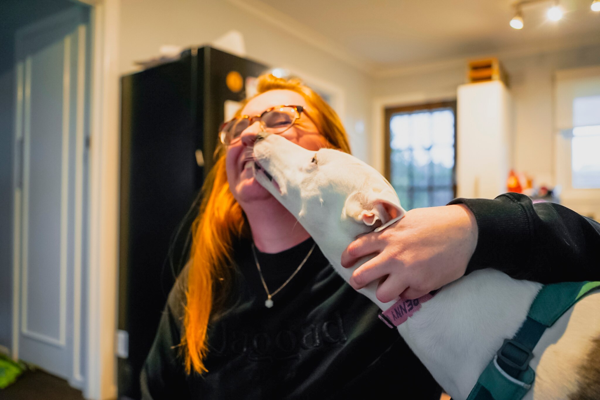 Seven years later, she has re-learned to walk and talk, and lives independently with her whippet, Penny.