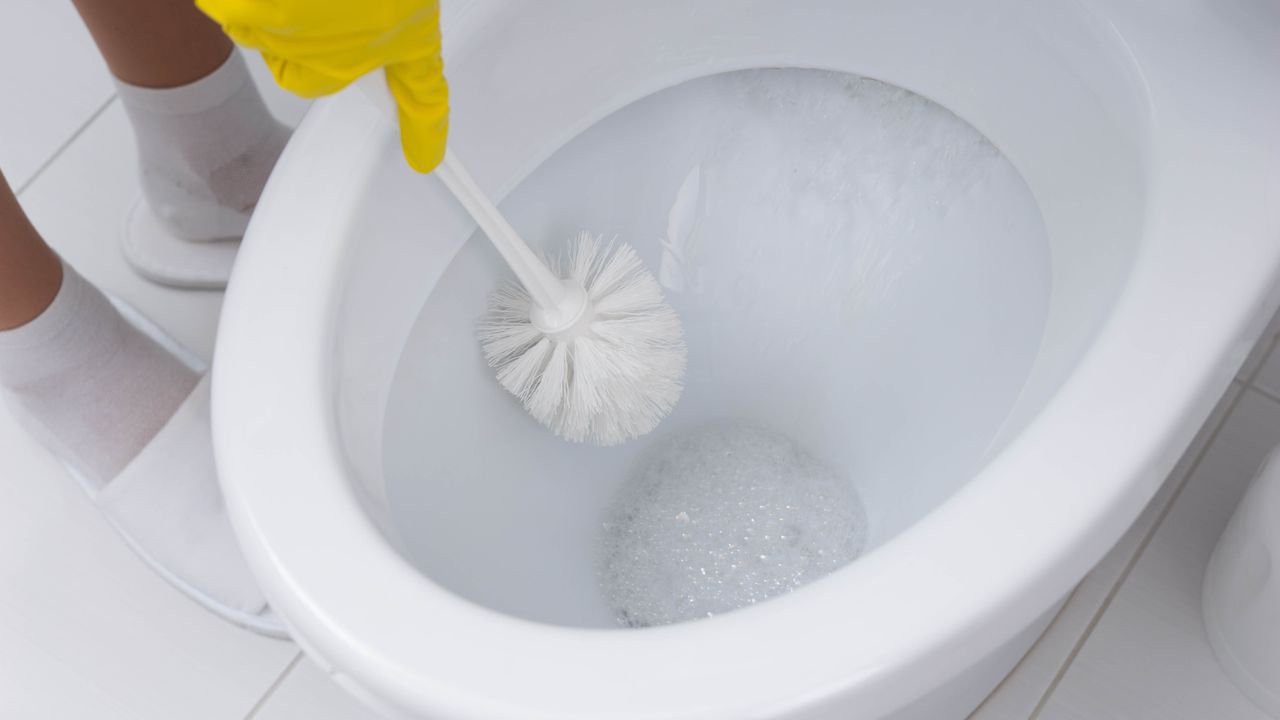 Just before bedtime, simply pour about one cup of white vinegar into the toilet bowl and let it sit for about a minute. Next, add half a cup of baking soda, and you should start to see a fizzing reaction as the two ingredients combine. Then close the lid and leave for up to eight hours overnight to let your solution get to work.